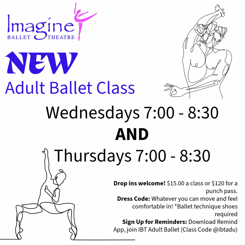 Discover the joy of movement and expression with our exhilarating adult ballet classes, held every Wednesday and Thursday night from 7:00 to 8:30. Whether you’re a seasoned dancer or taking your first graceful steps, our classes are designed to cater to all skill levels. Immerse yourself in the timeless art of ballet as our experienced instructors guide you through fundamental techniques, elegant routines, and fluid motions. With a focus on fostering a supportive and inclusive atmosphere, our classes provide the perfect opportunity to enhance flexibility, strength, and poise while connecting with like-minded individuals. Join us on Wednesday and Thursday nights and experience the transformative power of ballet in a welcoming and encouraging environment. Unleash your inner dancer – it’s never too late to embrace the beauty of ballet.